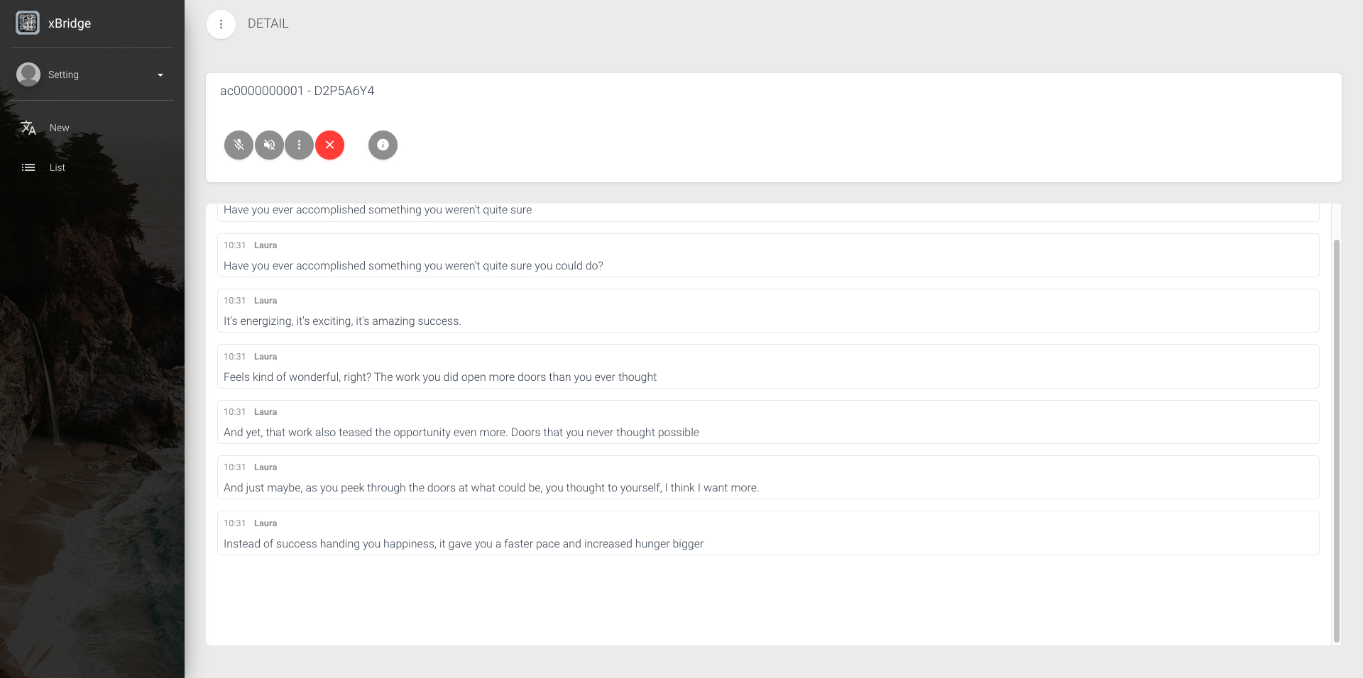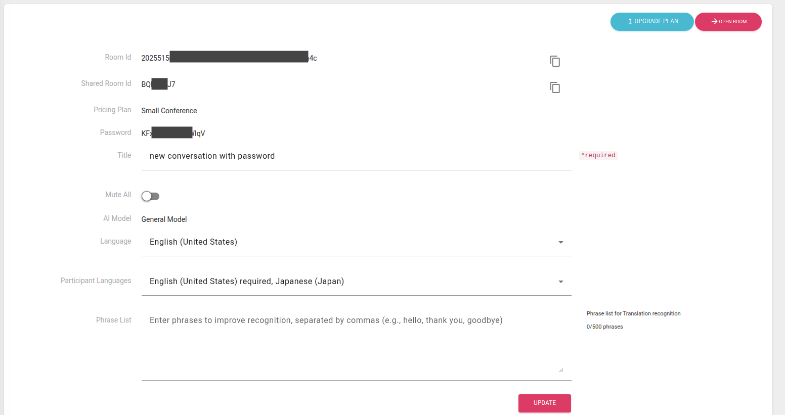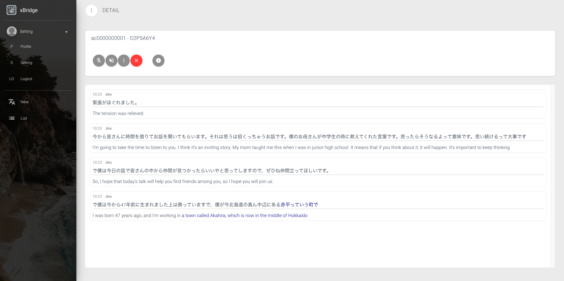 If the host acts as a speaker, click the microphone button to enable it and start the conversation. When enabled, a red microphone will be displayed. If you want to use voice readout for interpretation results, click the speaker button to enable it. When enabled, a red speaker will be displayed. When the meeting is finished, be sure to click the exit button to leave.